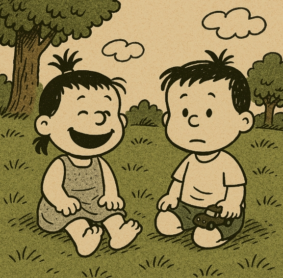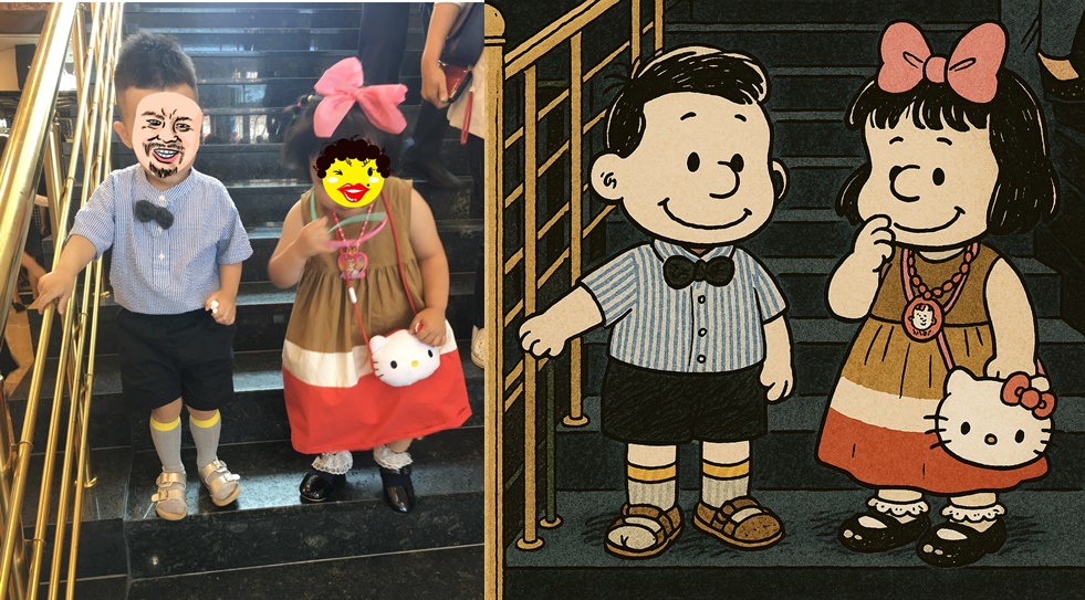 - " 부드러운 색상과 손으로 그린 선으로 이 사진을 피너츠 만화처럼 보이게해줘"