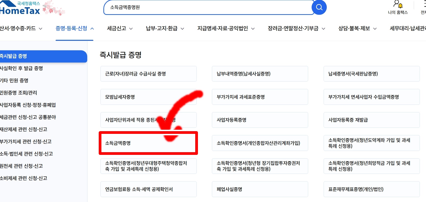| 2 | [민원증명] → [소득금액증명] 선택 |