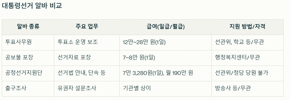 이번 글에서는 갑자기 치러지는 대통령선거에 따라 모집이 시작된 각종 대선 알바 종류, 조건, 급여, 지원 방법까지